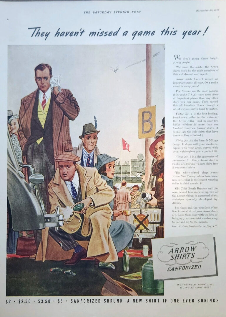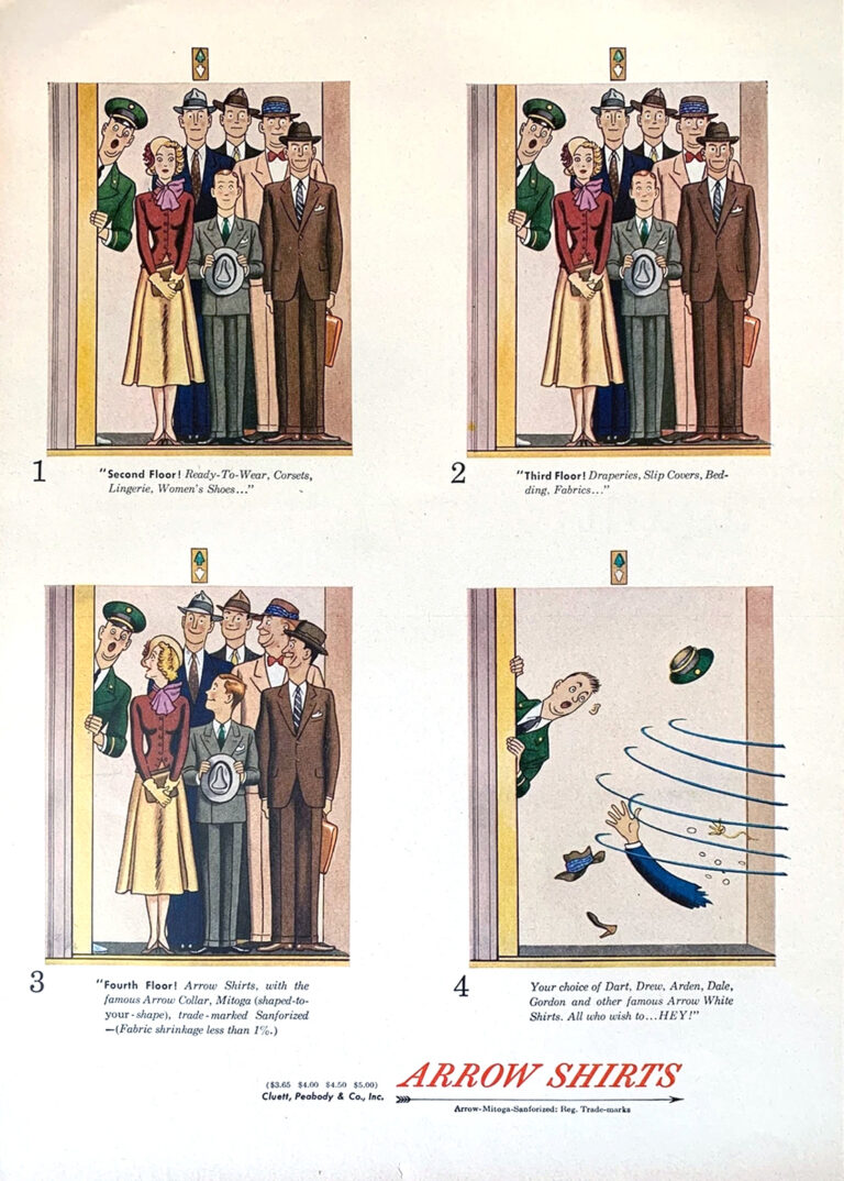 第一次世界大戦後、社会と服装は変化する。硬いデタッチャブルカラーは次第に敬遠され、1920年代には 襟付きソフトシャツ が主流となった。多くの襟メーカーが衰退する中、Arrowは生き残る。鍵となったのが、1919年に入社した サンフォード・L・クルエット による サンフォライズ加工 である。洗濯後の縮みを抑えるこの予縮技術は、襟付きシャツを実用レベルへ引き上げ、Arrowを「襟の会社」から「シャツの会社」へと完成させた。