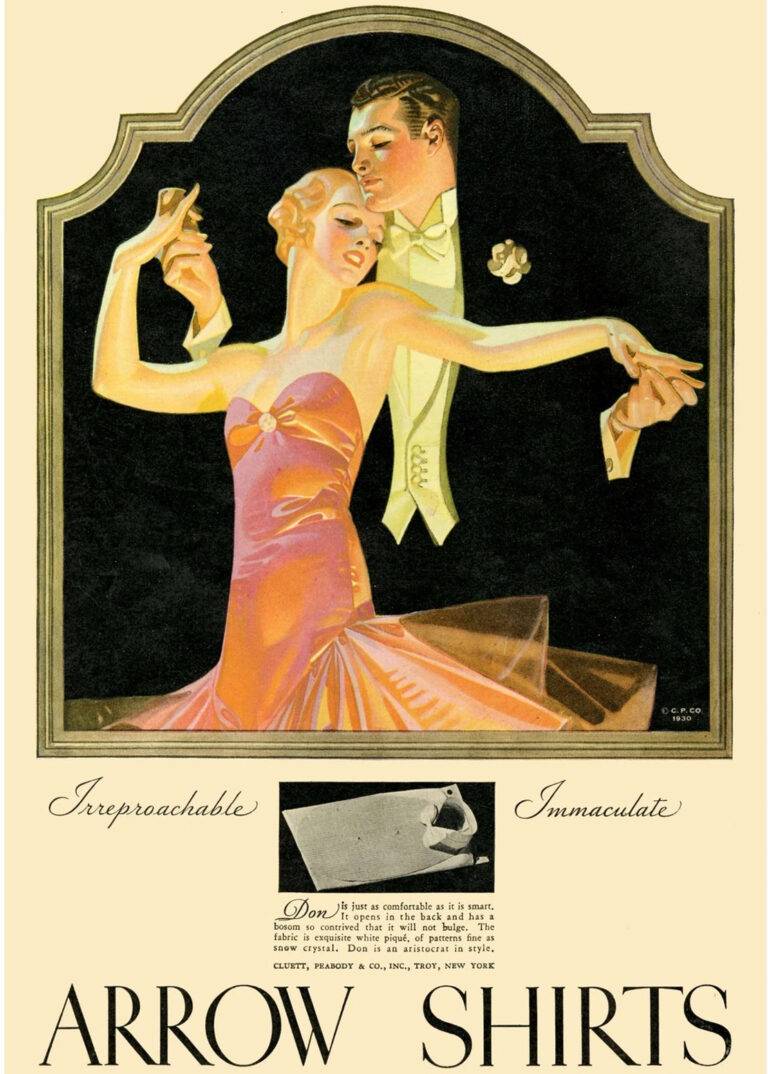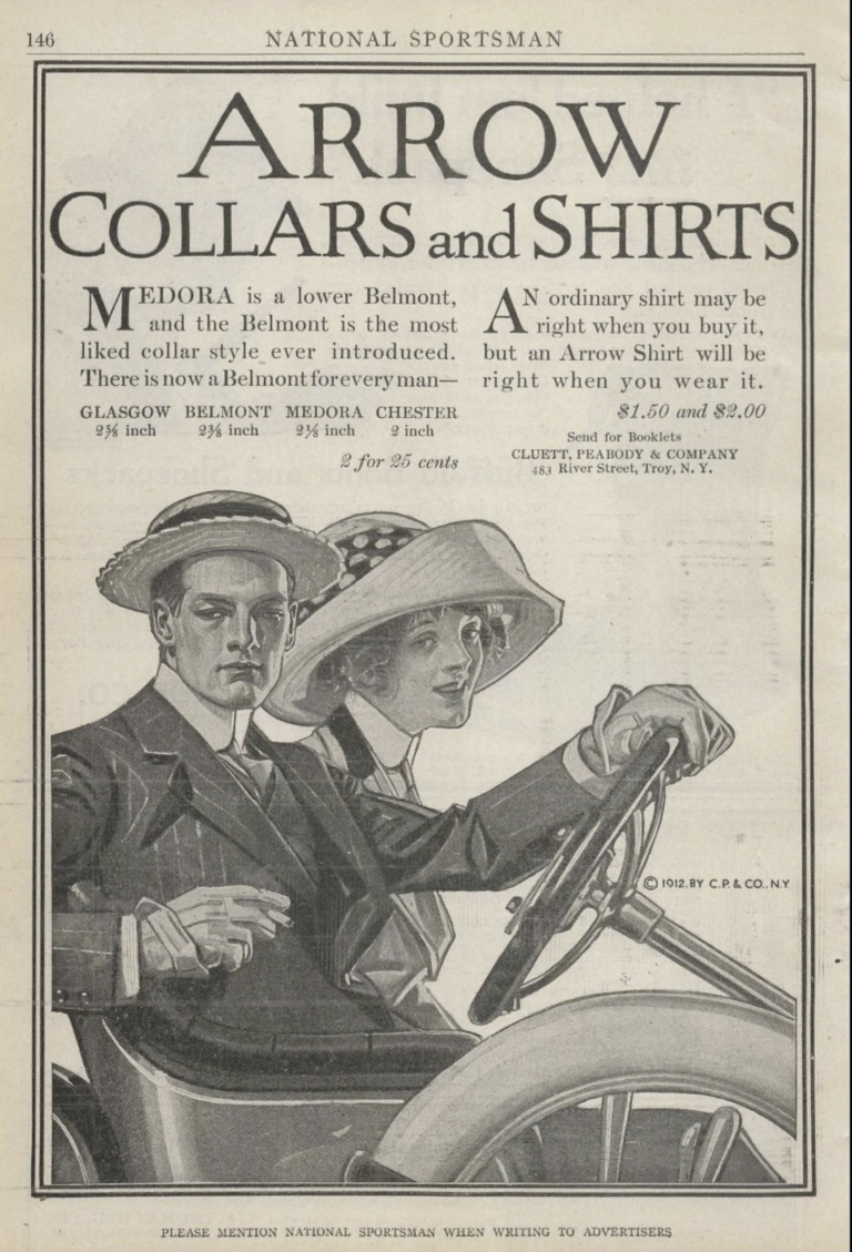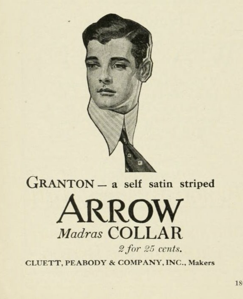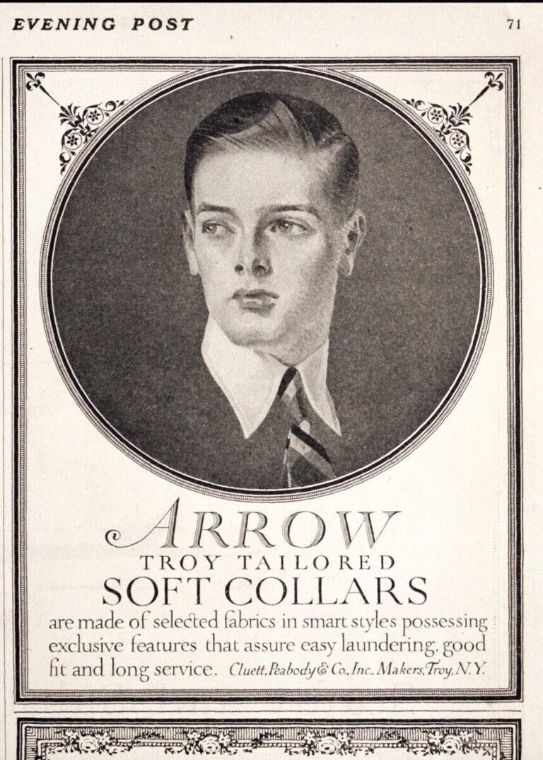 Cluett, Peabody & Company は、かつてニューヨーク州トロイを拠点とした、アメリカを代表するシャツおよびシャツ襟の製造企業である。19世紀半ばに取り外し式襟の製造から事業を開始し、やがて同地を「カラー・シティ」と呼ばれるまでに成長させた中心的存在であった。1899年に現在の社名となった同社は、当初は男性用の取り外し可能な襟を主力商品としていたが、20世紀に入ると Arrow ブランドのもとで事業を拡大する。1905年に始まった「Arrow Collar Man」の広告キャンペーンは、シャツや襟を単なる実用品から、理想的な男性像を象徴する存在へと押し上げ、ブランドの知名度を決定的なものにした。
