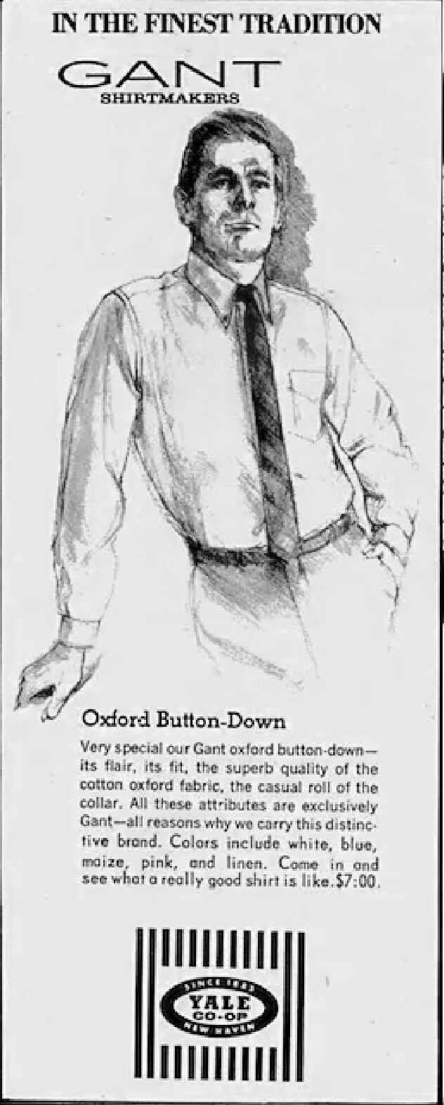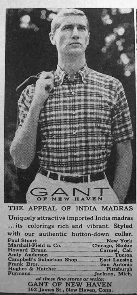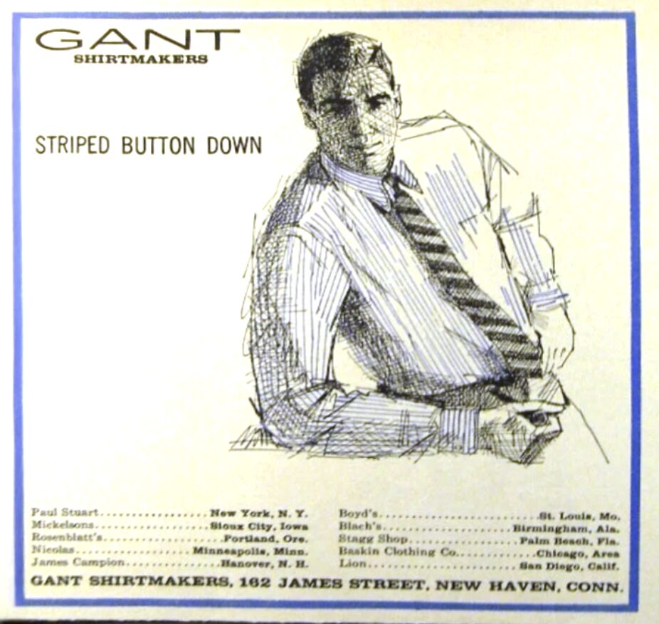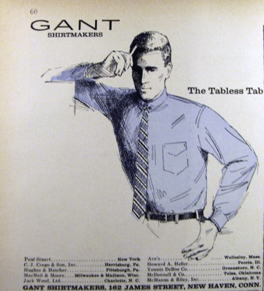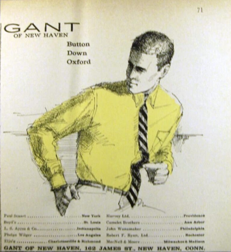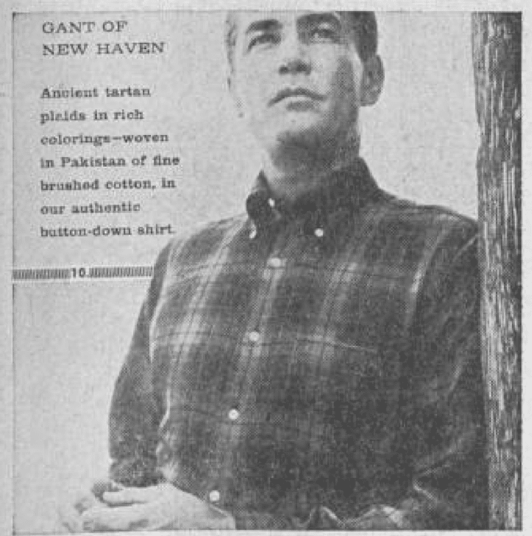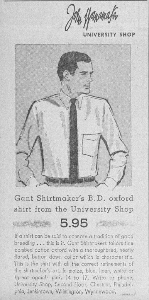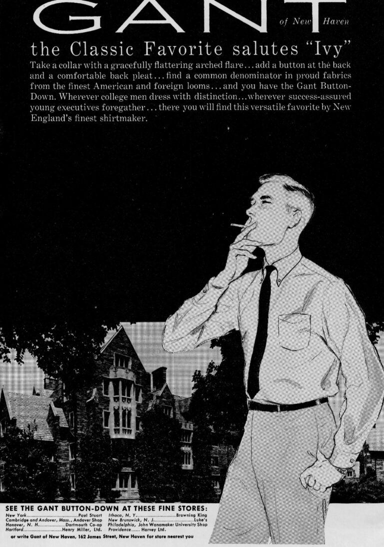 The significance of this GANT of New Haven advertisement lies in the placement of a button at the back of the collar to secure the tie. (As stated in the advertisement: “from the casual roll-front button-down collar and box pleat front, to the button in back of collar to keep the tie in place … every detail of styling is scrupulously correct.”) It also demonstrates that by the 1950s, the button-down shirt was already defined within the framework of Ivy League style, or Ivy fashion.
