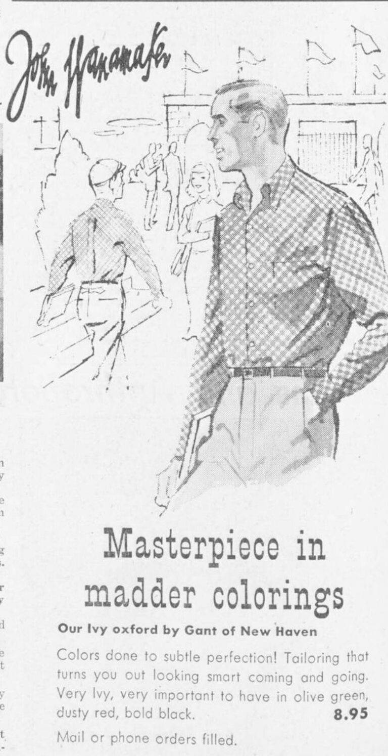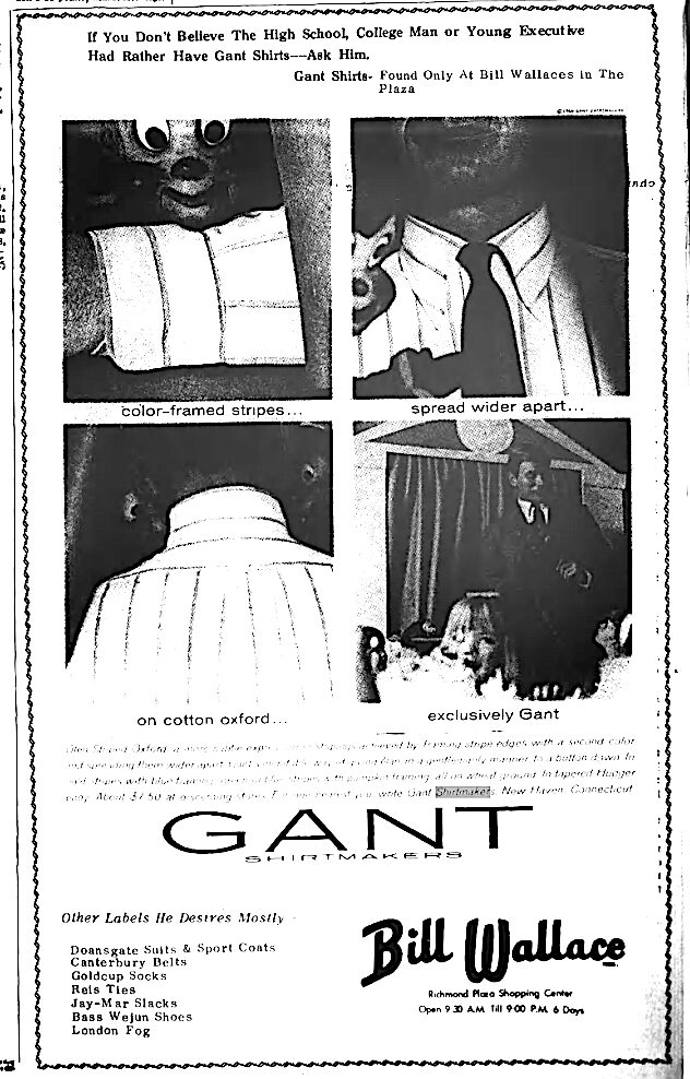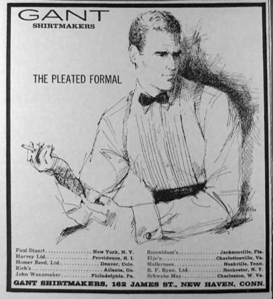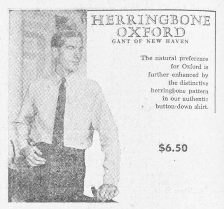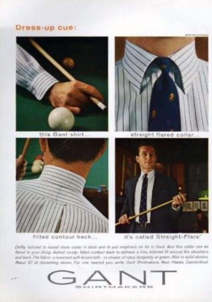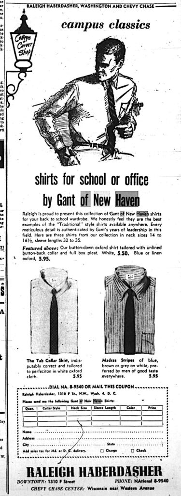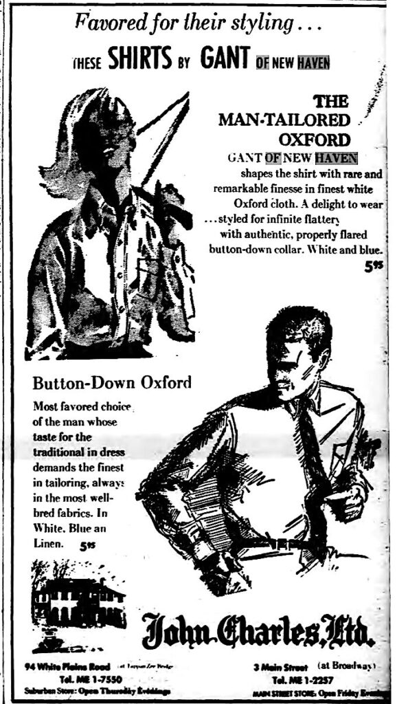 The significance of this GANT of New Haven advertisement lies in the placement of a button at the back of the collar to secure the tie. (As stated in the advertisement: “from the casual roll-front button-down collar and box pleat front, to the button in back of collar to keep the tie in place … every detail of styling is scrupulously correct.”) It also demonstrates that by the 1950s, the button-down shirt was already defined within the framework of Ivy League style, or Ivy fashion.