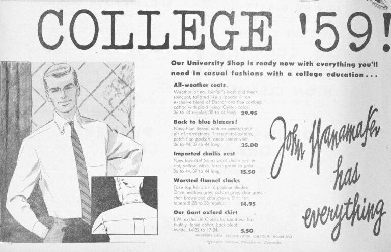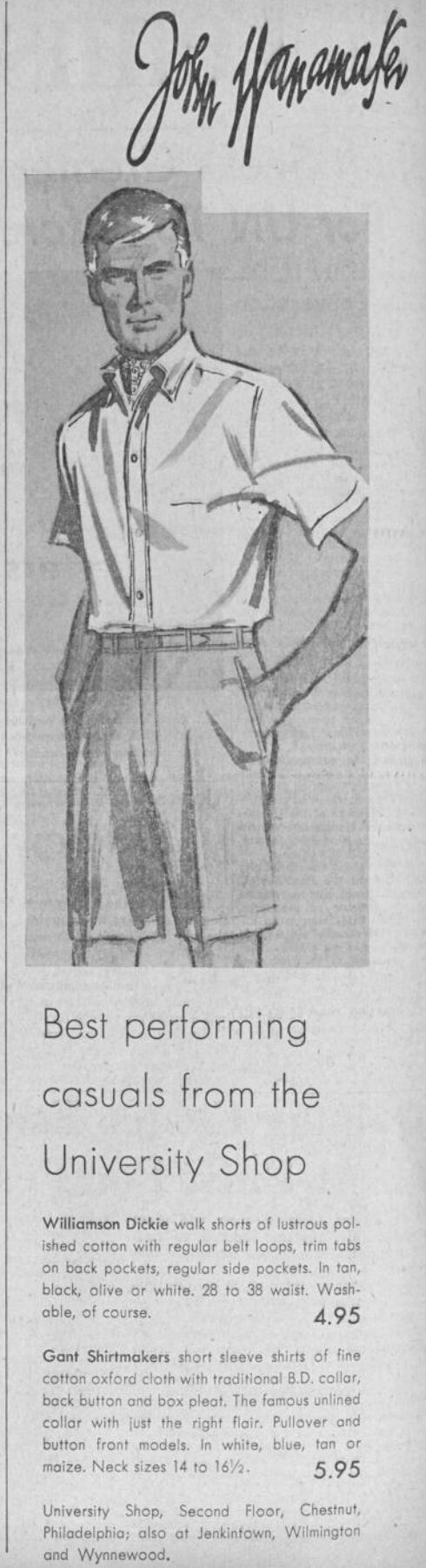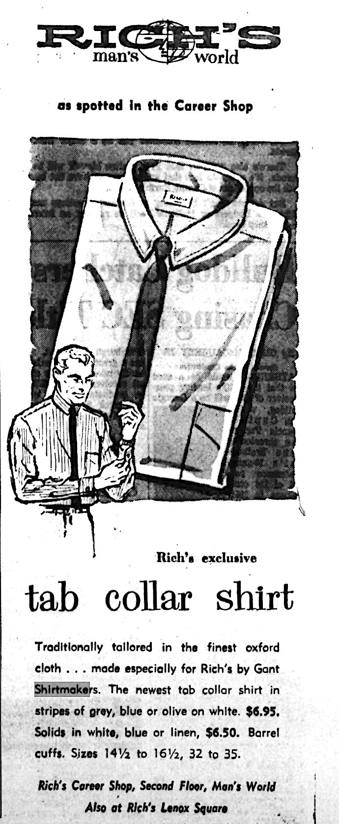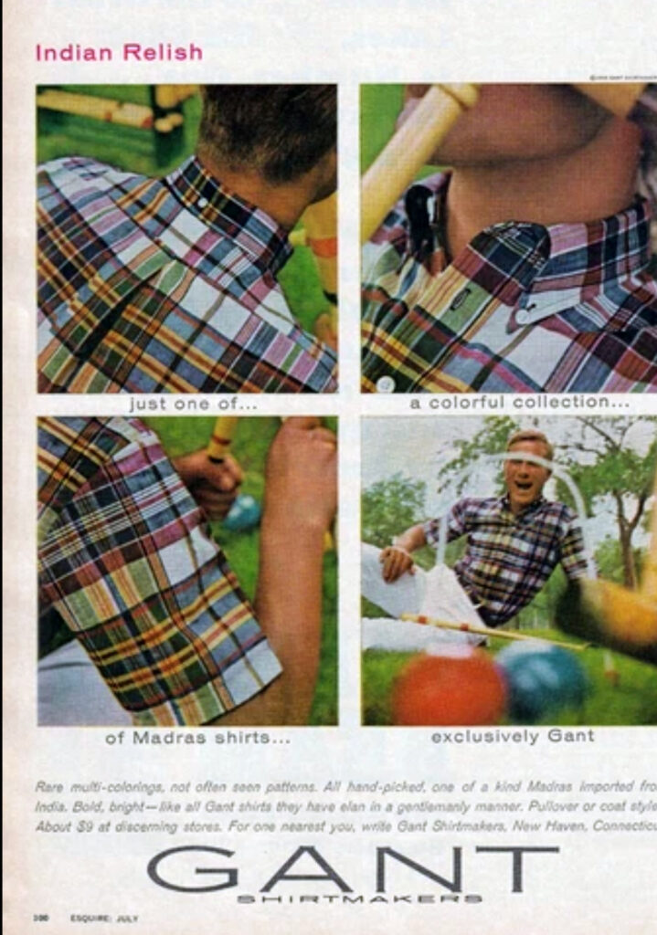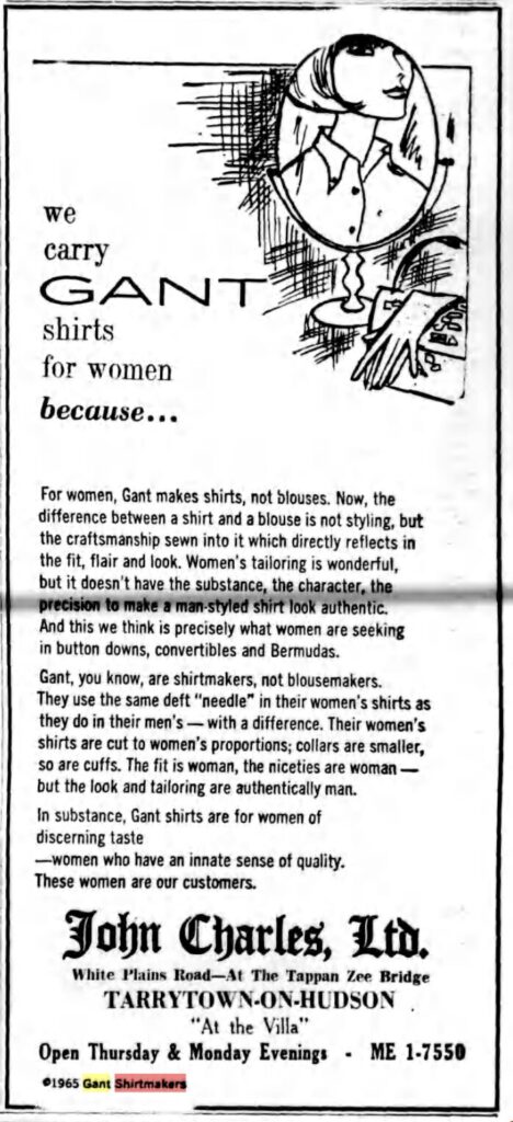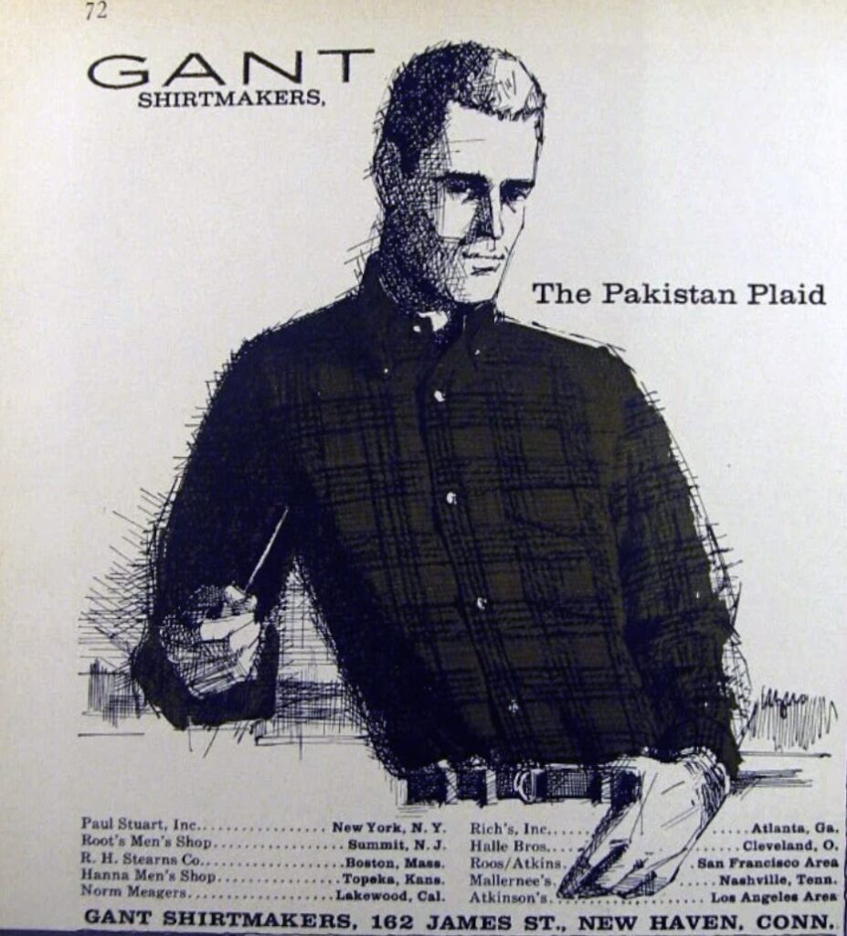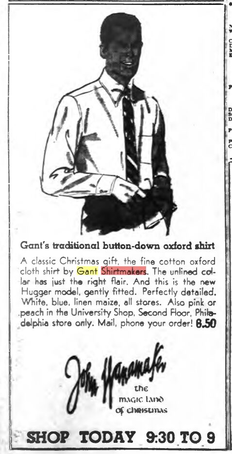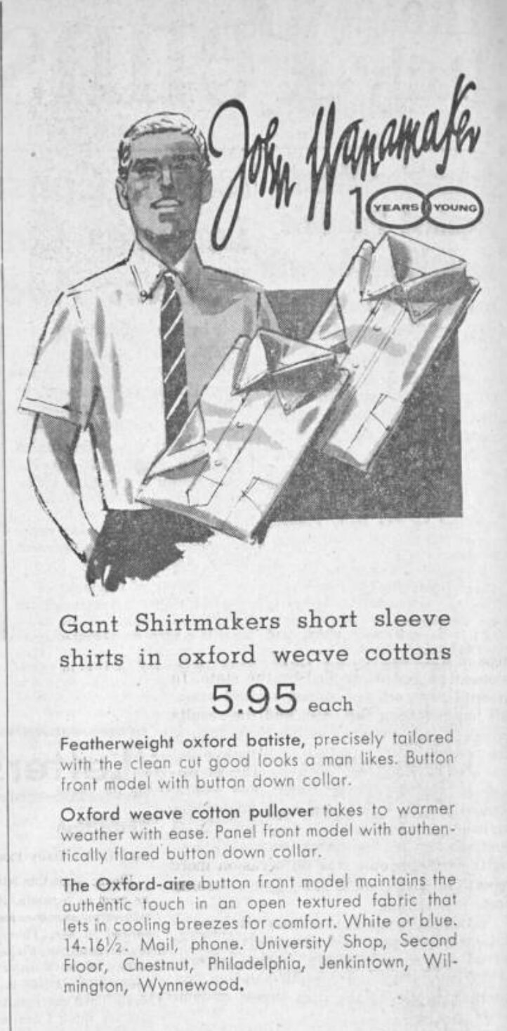 The significance of this GANT of New Haven advertisement lies in the placement of a button at the back of the collar to secure the tie. (As stated in the advertisement: “from the casual roll-front button-down collar and box pleat front, to the button in back of collar to keep the tie in place … every detail of styling is scrupulously correct.”) It also demonstrates that by the 1950s, the button-down shirt was already defined within the framework of Ivy League style, or Ivy fashion.
