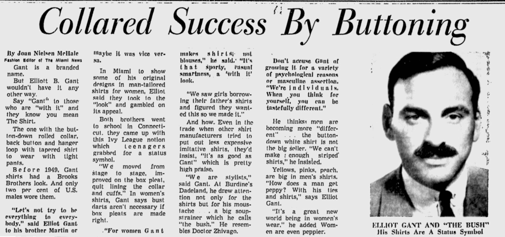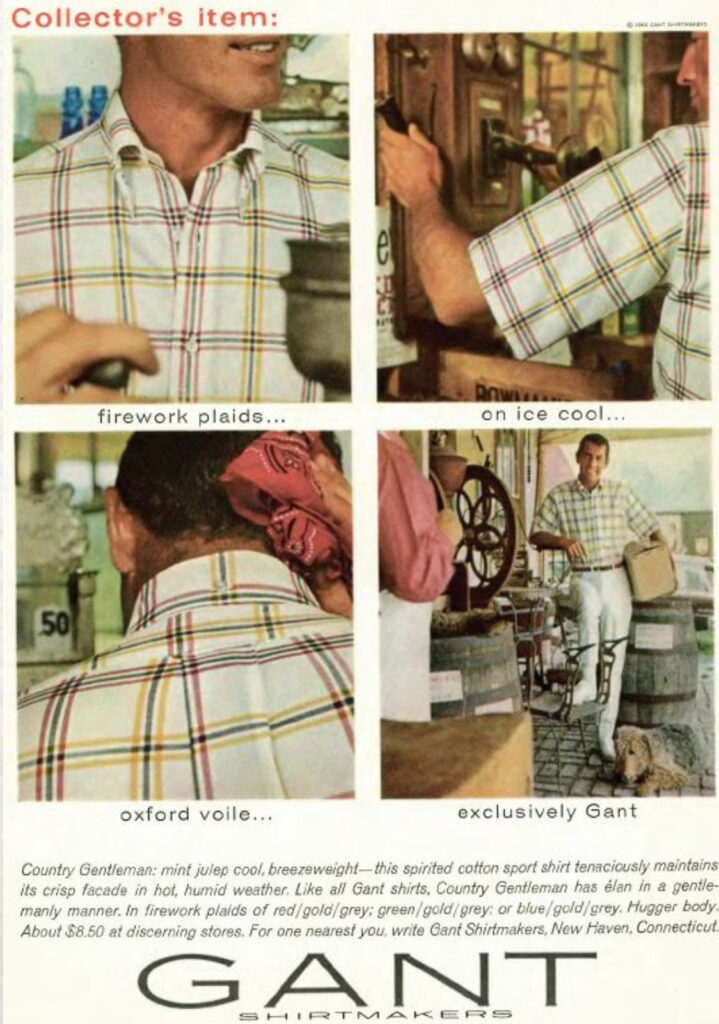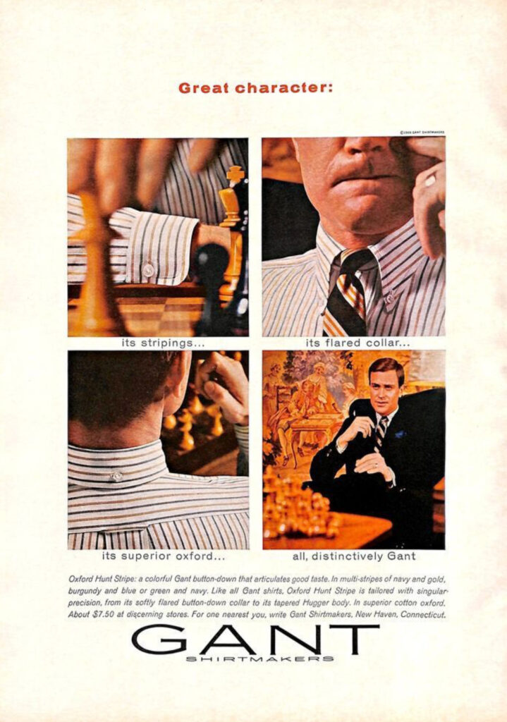 ニューヘイブンを拠点とし、特にイェール大学をはじめとするアイビーリーグのキャンパスに近い立地を背景に、GANTは自らのアイデンティティを築いていく。広告はまず『ニューヨーカー』誌などに掲載され、GANTは大学文化と結びついたシャツメーカーとして位置づけられた。ボタンダウンシャツは、GANTが発明したものではなかったが、流通がキャンパス内の店舗からマディソン・アベニュー、さらにはその先へと広がるにつれ、同社の名と強く結びつくようになっていった。エリオットとマーティン・ガントの指揮のもと、シャツにはいくつかの実用的な改良が加えられた。襟の構造は特徴的なロールを生むよう調整され、動きやすさのために背中にはボックスプリーツが加えられた。ネクタイを安定させるため、襟の後ろには追加のボタンが設けられ、結び目を持ち上げるための特許取得済みのボタンタブも導入された。さらに、シワを防ぐためのロッカーループも加えられた。これらのディテールはいずれも単体では革新的なものではないが、組み合わさることで、多くの顧客が「GANT」として認識するシャツを形づくっていった。