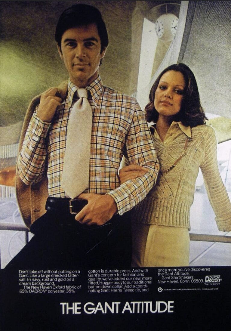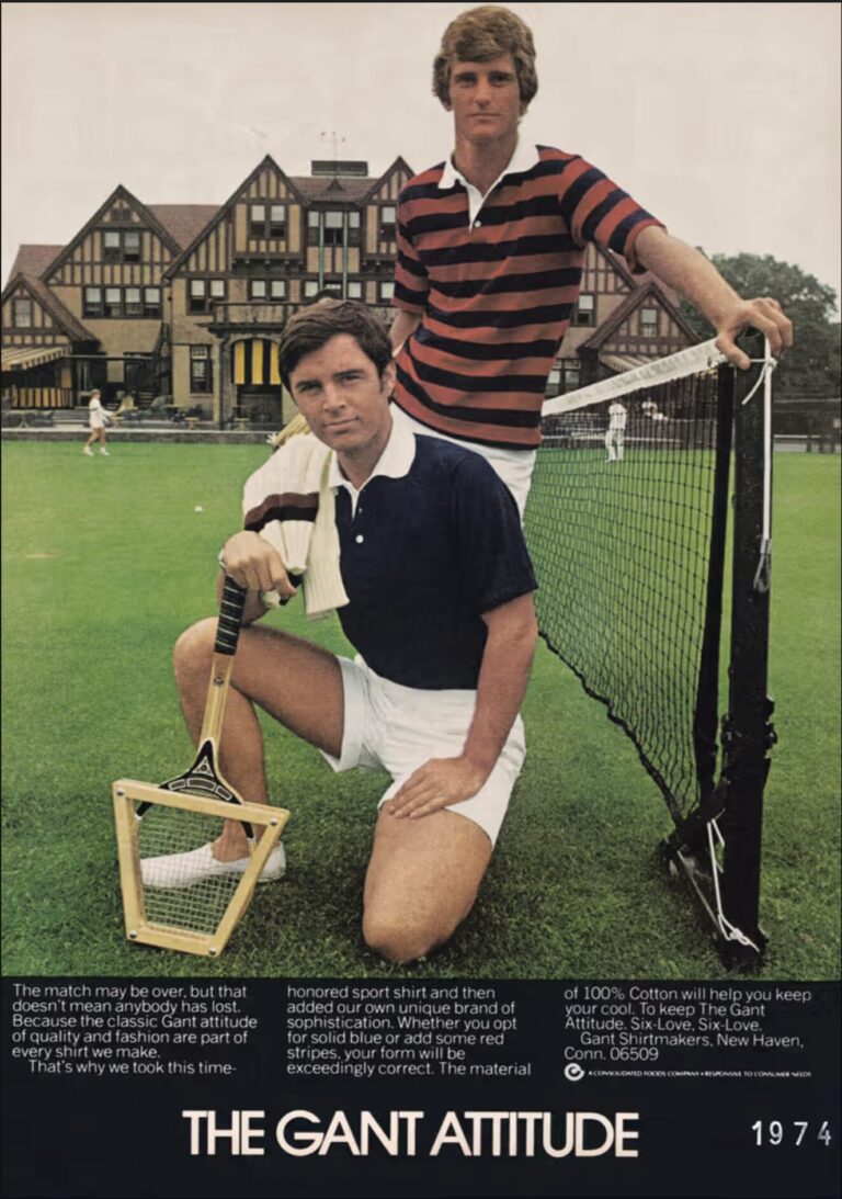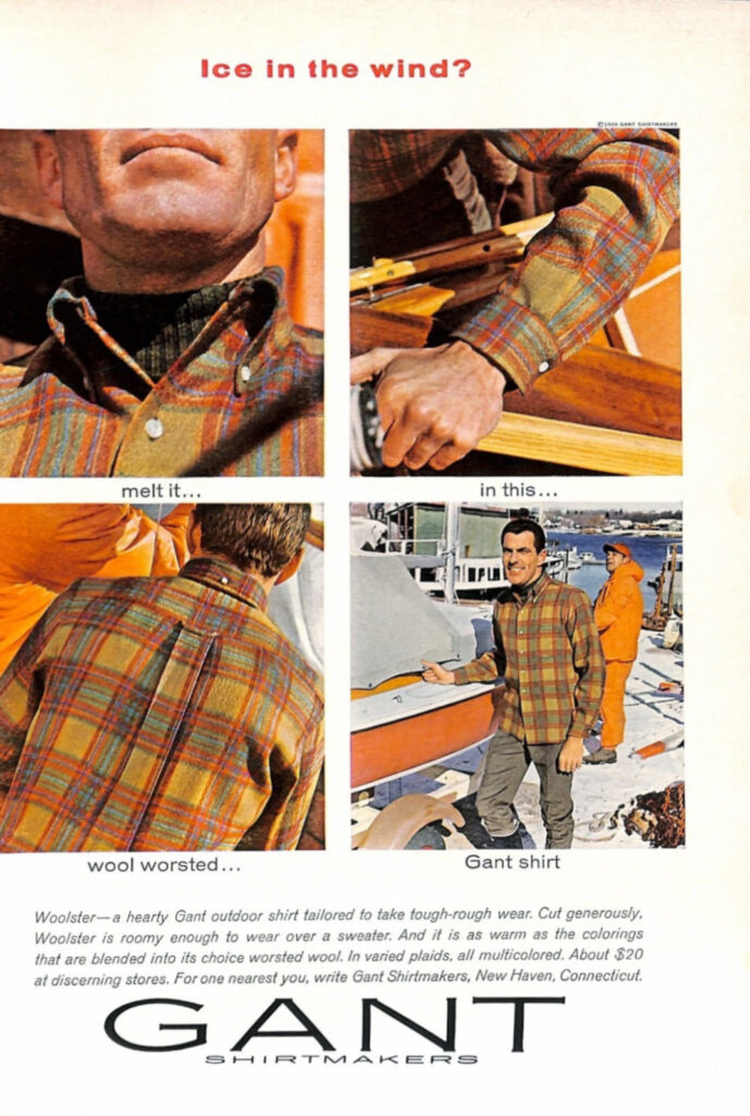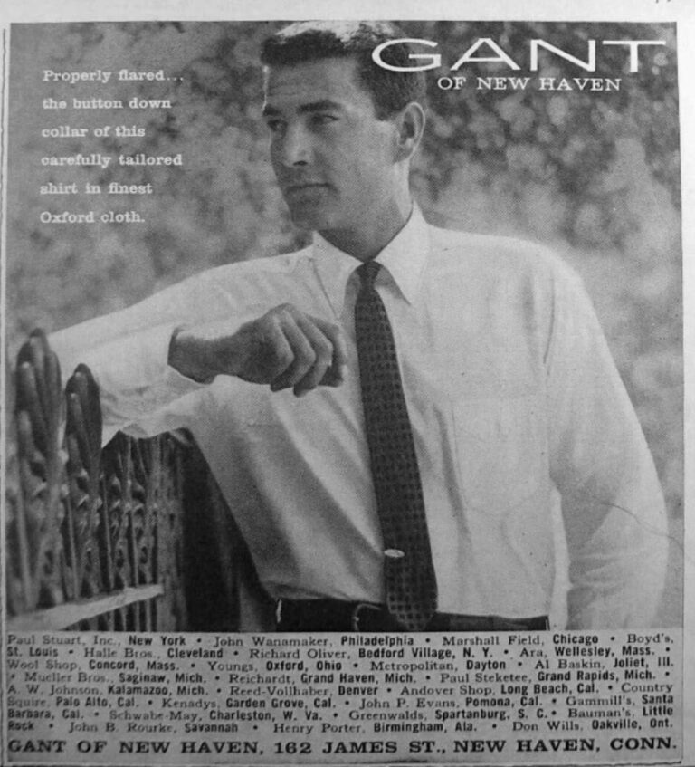 From New Haven—within reach of Ivy League campuses, particularly Yale—the company began to build its identity. Advertising first appeared in publications such as The New Yorker, and GANT positioned itself as a shirtmaker associated with collegiate life. The button-down shirt, while not invented by the company, became closely identified with it as distribution expanded from campus stores to Madison Avenue and beyond. Under the direction of Elliot and Martin Gant, a number of practical refinements were introduced. Collar construction was adjusted to produce a distinctive roll. A box pleat was added to the back for ease of movement. An extra button was placed behind the collar to help keep the tie in position, along with a patented button tab designed to lift the knot. A hanger loop was added so the shirt could be hung without wrinkling. None of these details were radical in isolation, but together they defined the shirts most customers came to recognize as “GANT.”