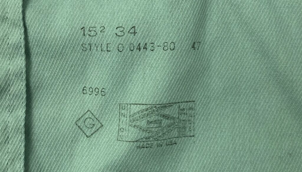 GANTは創業初期から自社工場生産のシャツは、裾部分に小さくスタンプされた菱形の中に「G」を配したマークをスタンプしてあり、後年これをマーケティングとして「ダイアモンドG」と呼ばれるようになりました。このマークの使用は1949年以降とされているがその正確な導入意図は同時代資料は限られている。現存する実物や後年の社史的記述から確認できるのは、当初この印がブランドを前面に押し出すための表示ではなく、あくまで控えめなかたちで用いられていたという点である。アメリカ製造時代においてこの「G」マークはMADE IN NEW HAVENと呼んでいいだろう。