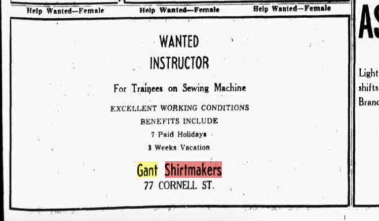 Through the late 1950s and into the 1960s, Gant maintained multiple manufacturing sites, including additional locations on East Street and at 162 James Street in New Haven, as well as facilities in West Haven (Wood Street), Wauregan, Connecticut, Kingston, New York, and Salisbury, Maryland.