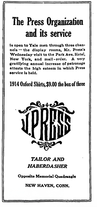 This advertisement is significant in that it demonstrates that by 1923, J. Press was already offering ready-made Oxford shirts on a continuing basis (likely manufactured by Hathaway at the time). The advertisement also explicitly states that Mr. Press himself visited the Park Avenue Hotel in New York every Wednesday to attend to customers. This provides evidence that, while based in New Haven, J. Press maintained direct and personal relationships with Yale alumni.