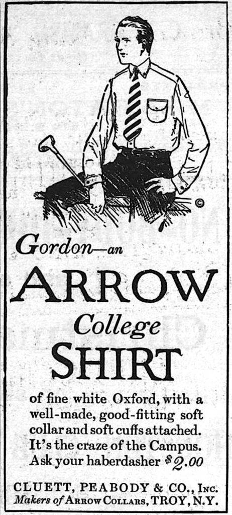 私の現時点(2026)での主張は”IVY学生向けのボタンダウンオックスフォードシャツ”の元祖はARROW社のGORDONモデルの誕生だと思っている。確かにブルックスブラザーズのボタンダウンの主張はわかっているが『彼らのボタンダウンが見つからない(シャツを作っているのはわかっている)』『英国ではすでにボタンダウン襟は浸透している(製造はターンブル&アッサーやE.TAUZか)』など確定事項として口伝でしか言えないことが多いからである。まずは1914年にOXFORD生地を使ったボタンダウンシャツというのがアメリカで販売されたのは確実であり、ひとまずここを起点として今は考えたい