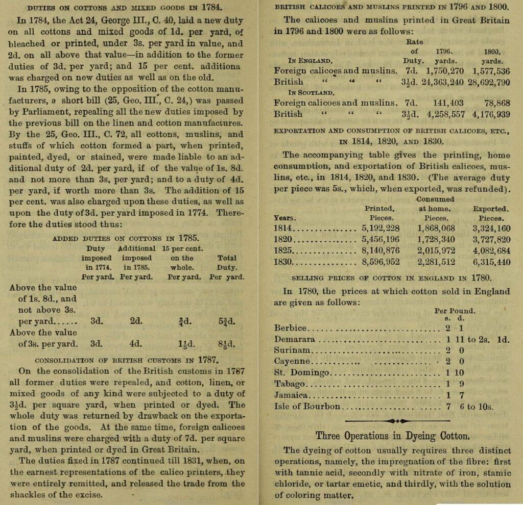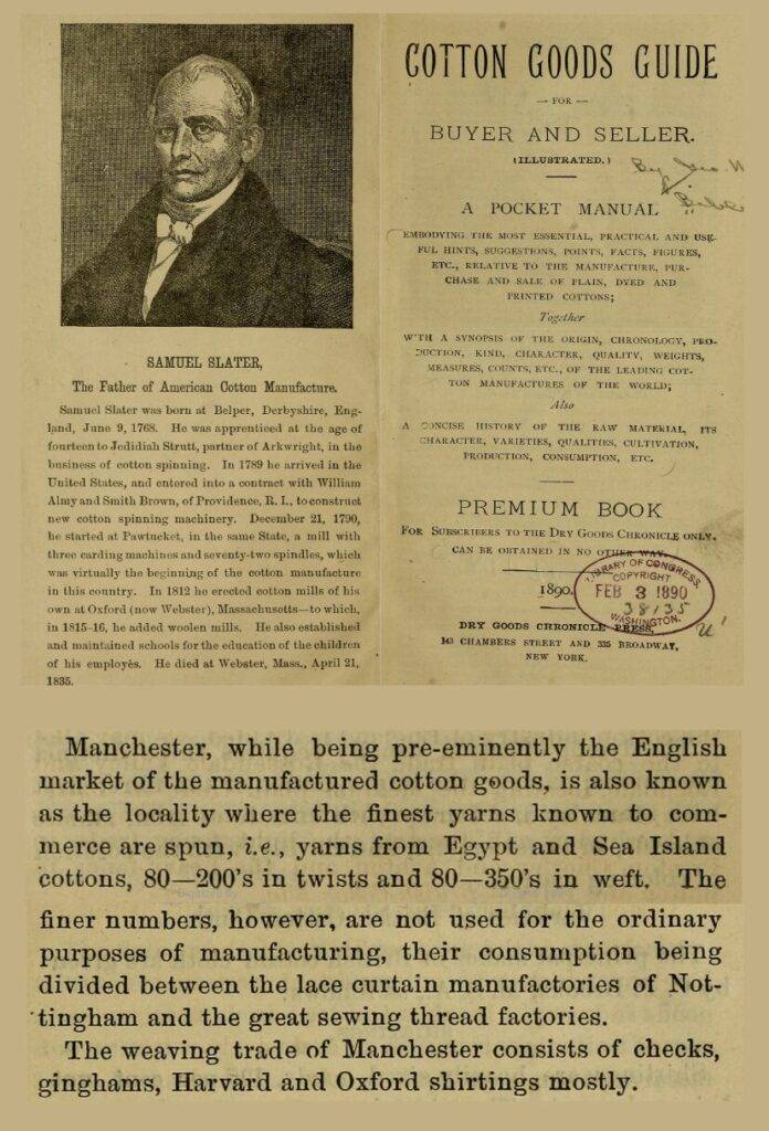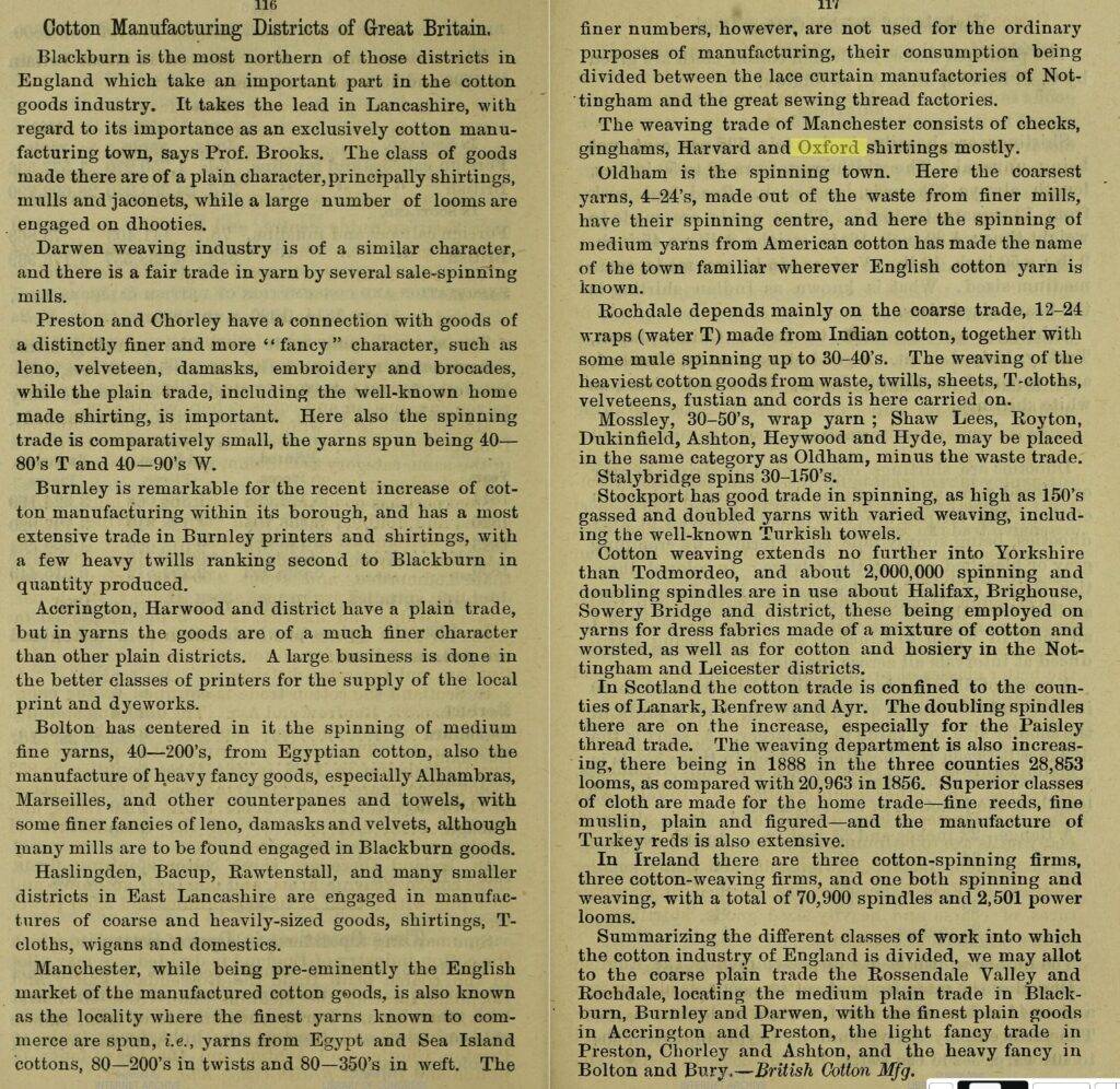 Manchester, while being pre-eminently the English market of the manufactured cotton goods, is also known as the locality where the finest yarns known to commerce are spun, i.e., yarns from Egypt and Sea Island cottons, 80—200’s in twists and 80—350’s in weft.The finer numbers, however, are not used for the ordinary purposes of manufacturing, their consumption being divided between the lace curtain manufactories of Nottingham and the great sewing thread factories. The weaving trade of Manchester consists of checks, ginghams, Harvard and Oxford shirtings mostly.