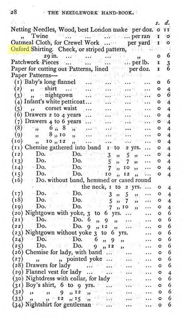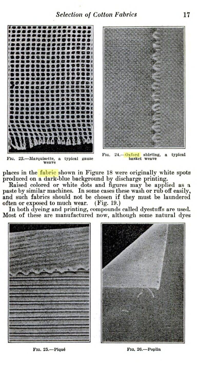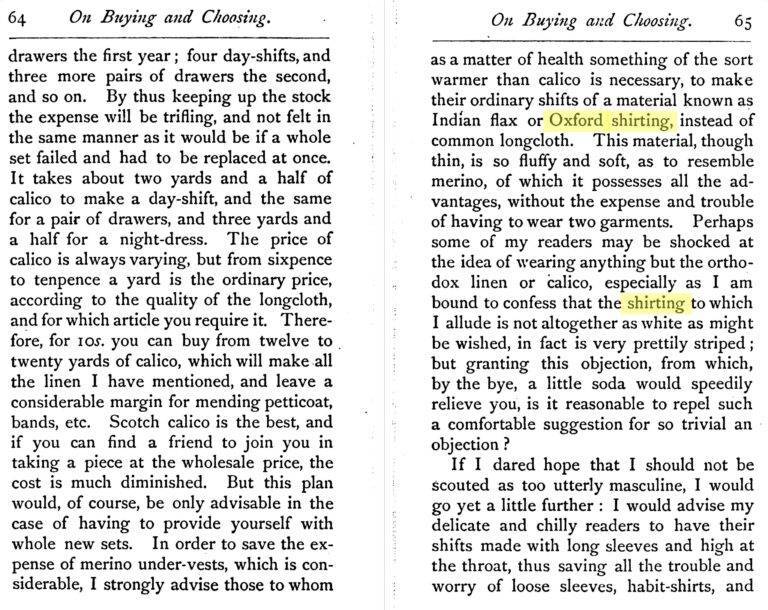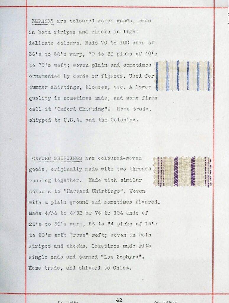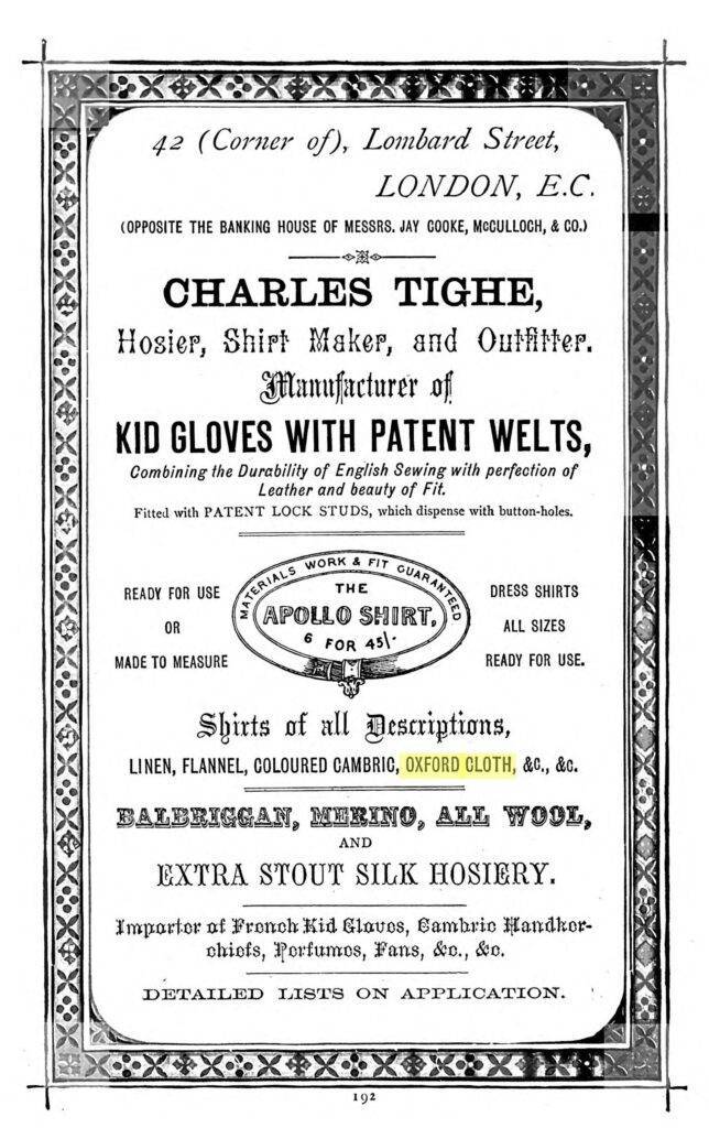 “The origin of ‘Oxford’ cloth is not hard to trace. Several years ago a shirt manufacturer in England who desired to secure the patronage of the students in the famous British university, brought out a fabric that was characterized by its rough texture and by the similarity of the construction to what is known as basket-weave. This cloth was given the trade name ‘Oxford,’ and immediately found great favor among the students…”