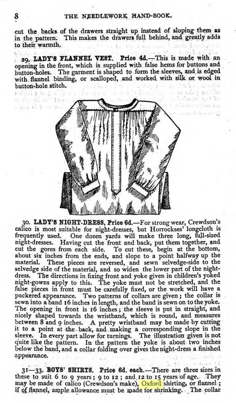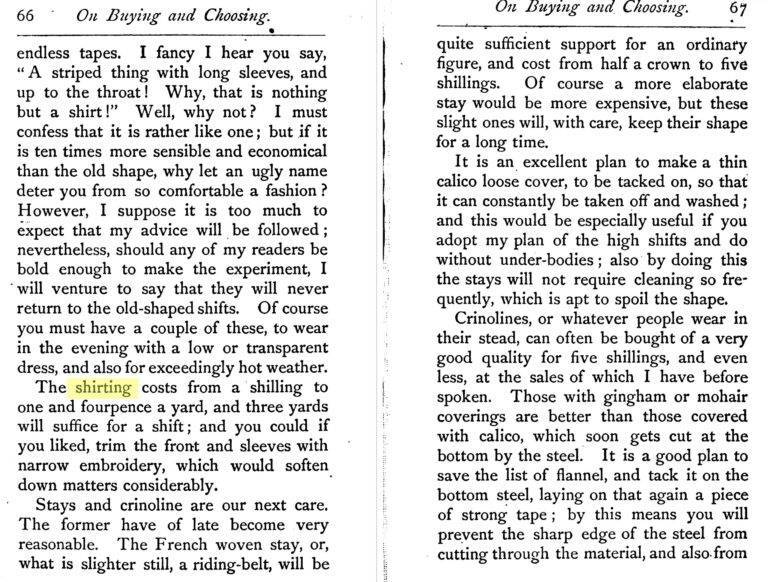 In order to save the expense of merino under-vests, which is considerable, I strongly advise those to whom as a matter of health something of the sort warmer than calico is necessary, to make their ordinary shifts of a material known as Indian flax or Oxford shirting, instead of common longcloth. This material, though thin, is so fluffy and soft, as to resemble merino, of which it possesses all the advantages, without the expense and trouble of having to wear two garments. Perhaps some of my readers may be shocked at the idea of wearing anything but the orthodox linen or calico, especially as I am bound to confess that the shirting to which I allude is not altogether as white as might be wished, in fact is very prettily striped ; but granting this objection, from which, by the bye, a little soda would speedily relieve you, is it reasonable to repel such a comfortable suggestion for so trivial an objection ?