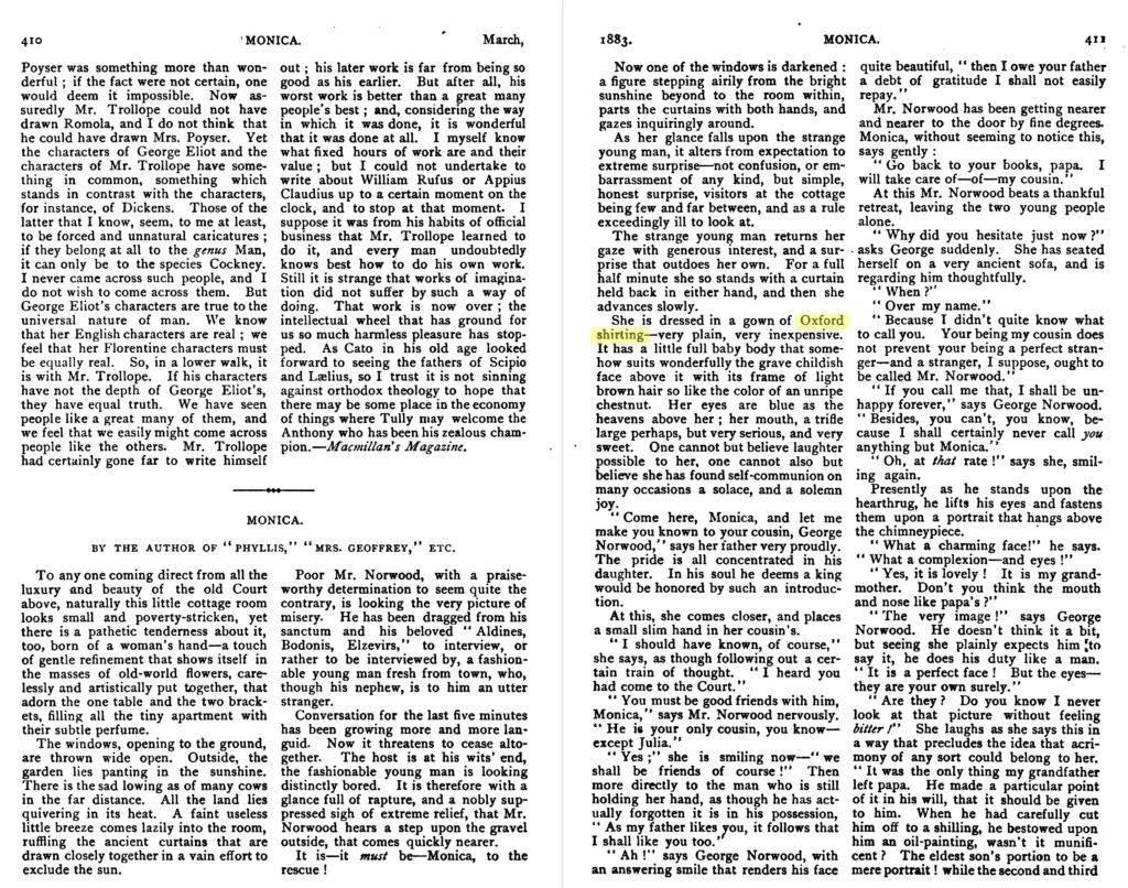 “Come here, Monica, and let me make you known to your cousin, George Norwood,” says her father very proudly. The pride is all concentrated in his daughter. In his soul he deems a king would be honored by such an introduction.