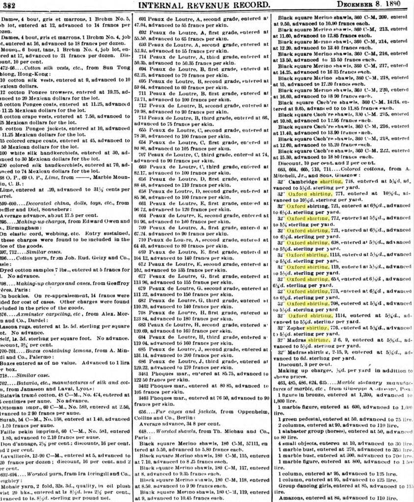 この1890年12月8日付の米国税関公報には、**「32″ Oxford shirting」および「32″ Cambridge shirting」**が正式な品目名として列記され、1ヤード(約91.4cm)あたりの申告価格と再評価後価格が記録されている。これは、19世紀末の時点で、オックスフォードおよびケンブリッジ名のシャツ地が、単なるブランド名ではなく国際貿易と関税制度の枠組みの中で商品分類として認識され、アメリカ市場に流通していたことを示す一次史料である。