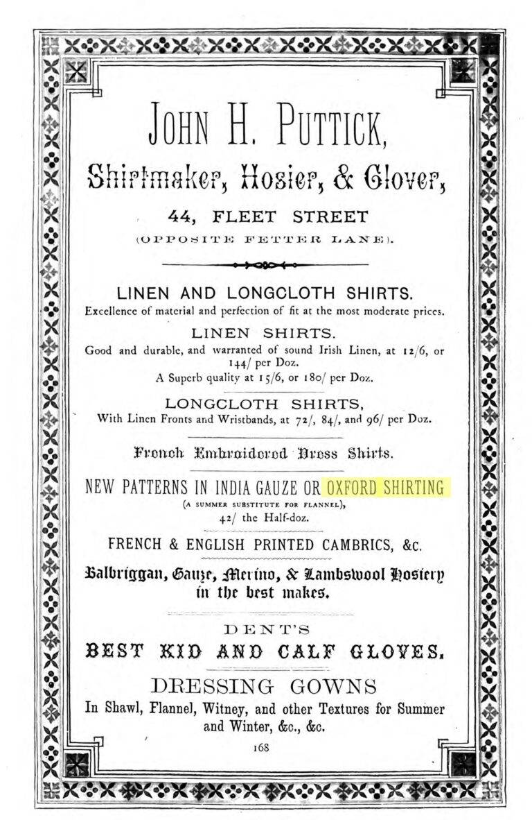 「『オックスフォード』クロスの起源をたどるのは難しくない。数年前、イングランドのあるシャツ製造業者が、有名な英国の大学の学生たちの支持を得ようとして、粗い質感と、いわゆるバスケット織に似た構造を特徴とする生地を作り出した。この生地には『オックスフォード』という商業名が与えられ、学生たちの間でたちまち大きな人気を博した……」