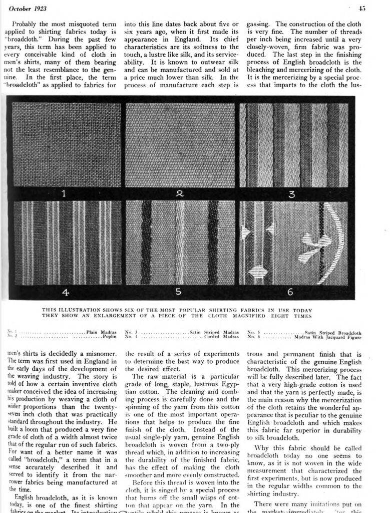 “Today we have broadcloths, Oxford cloths, Cambridge cloths, poplins, and a host of other non-descriptive trade names that mean absolutely nothing as far as the manufacture of the cloth is concerned, but are simply misnomers applied to ordinary madras constructions for which no other name could be found.”
