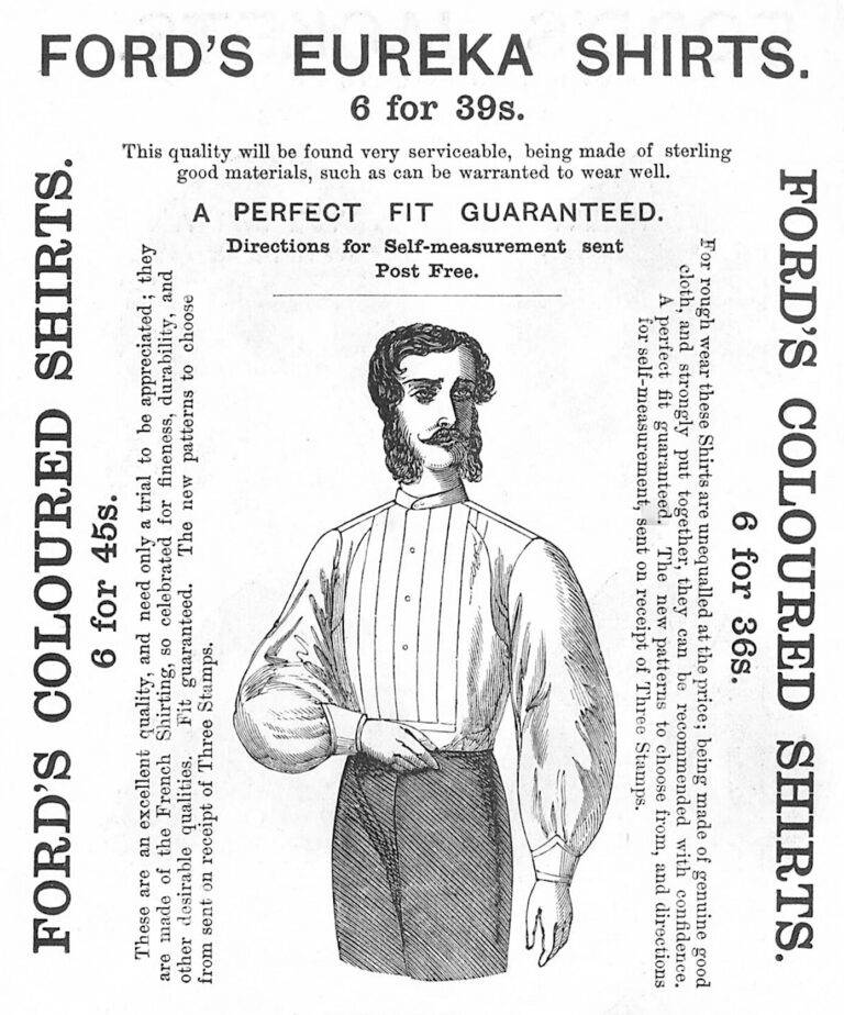 Eureka Shirts emerged in 1848 as an improved form of shirt devised by Richard Ford, distinguished by a particular shape. From the following year, 1849 onward, all of his products were sold under the unified name “Ford’s Eureka Shirts” and circulated in the market. Advertisements carried the phrase “A Perfect Fit Guaranteed,” presenting the shirts as ready-made garments that nevertheless emphasized how well they fitted the body. Buyers were sent self-measurement instructions and a price list by post, allowing them to select their shirts according to their own measurements.