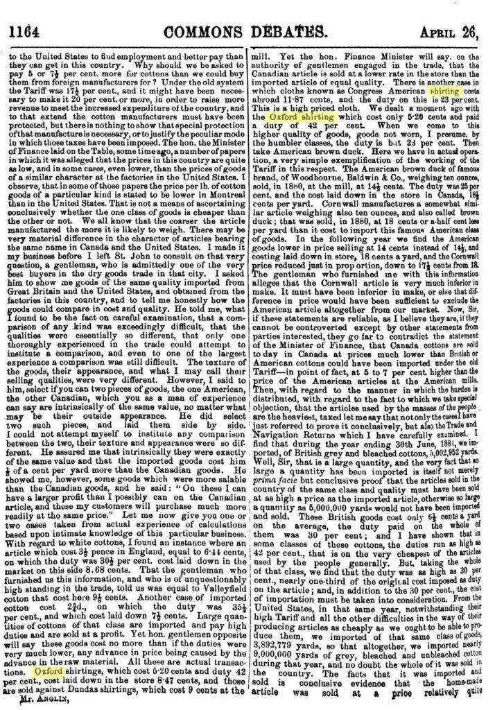 Yet the hon. Finance Minister will say, on the authority of gentlemen engaged in the trade, that the Canadian article is sold at a lower rate in the store than the imported article of equal quality. There is another case in which cloths known as Congress American shirting costs abroad 11·87 cents, and the duty on this is 23 per cent. This is a high priced cloth. We dealt a moment ago with the Oxford shirting which cost only 5·20 cents and paid the duty of 42 per cent. When we come to this higher quality of goods, goods not worn, I presume, by the humbler classes, the duty is but 23 per cent.