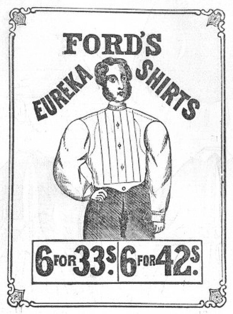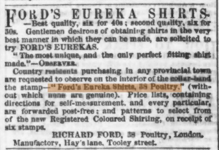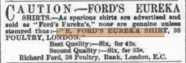 Authenticity was indicated by a stamp placed on the inside of the collar. The words “Ford’s Eureka Shirt, London” or “33 Poultry” were enclosed within an octagonal lozenge-shaped frame, with the term “Trade Mark” printed outside it, serving as the mark of a genuine Eureka Shirt.