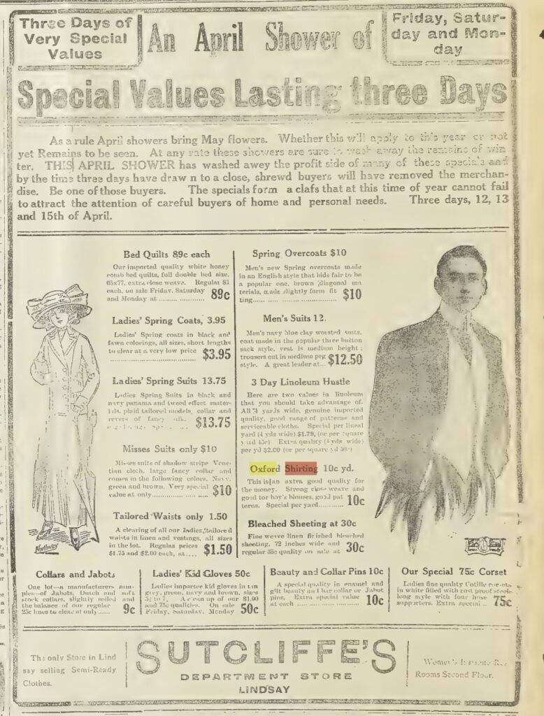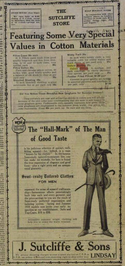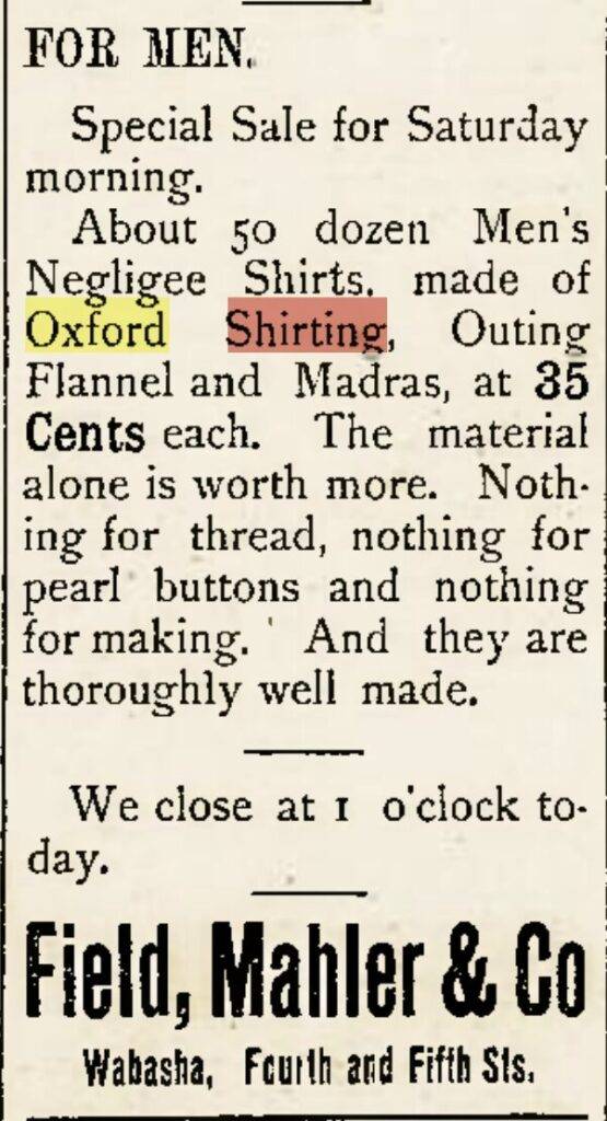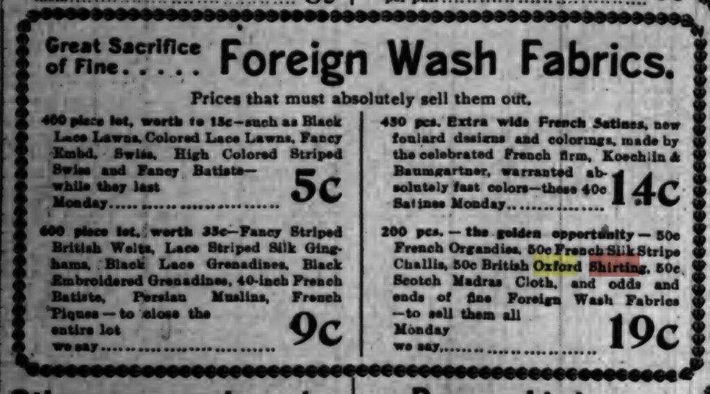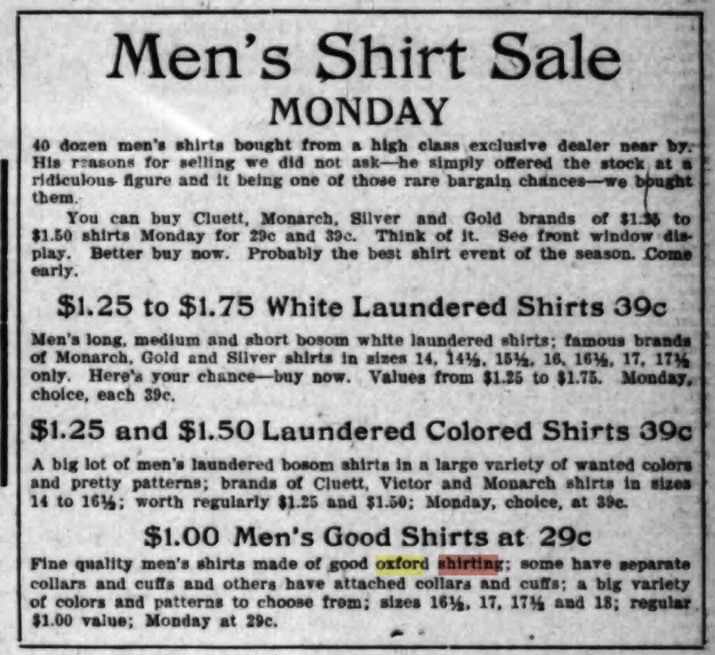 Advertisements in the Lindsay Post published in Lindsay, Ontario, in May 1917 and July 1918 state that “Oxford shirting” was sold not as ready-made shirts but as shirting fabric, offered “per yard.”