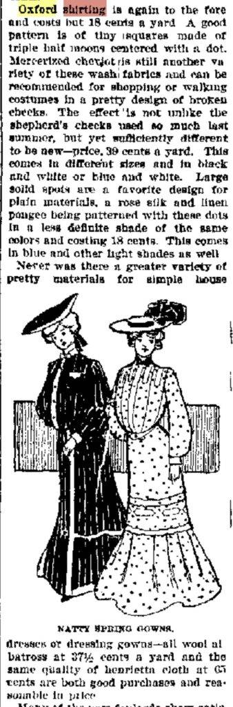 Oxford shirting is again to the fore and costs but 18 cents a yard.
