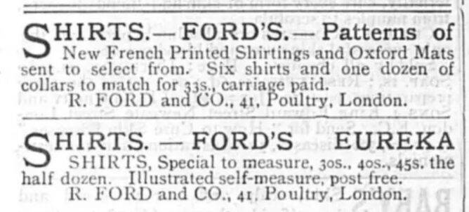 シャツ。——新しく登録されたオックスフォードおよびケンブリッジ・シャツ地。20種類の柄があり、すべて新作で、すぐにお選びいただけます。縮みません。現在、最もファッショナブルなシャツです。見本(パターン)は無料です。詳細は特許権者である R. FORD and Co.(住所:38, Poultry, E.C.)まで。