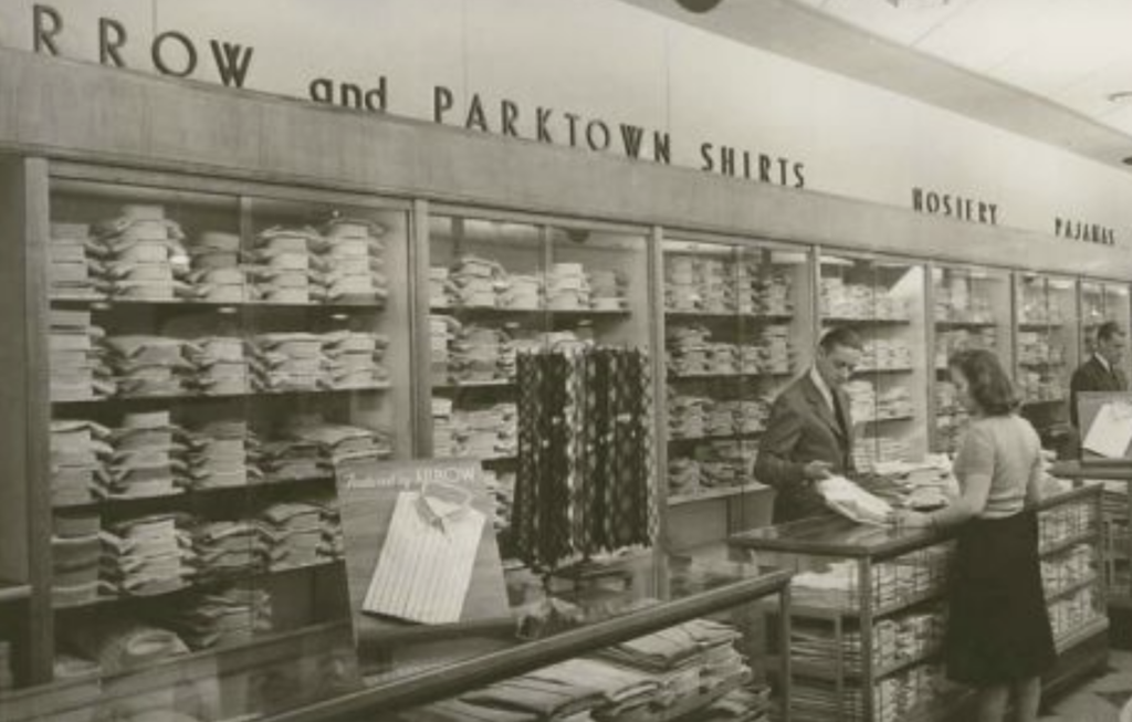 Arrow’s growth was not limited to manufacturing capacity alone. Through widely recognized advertising—most notably the Arrow Collar Man campaign—the brand established a unified image of modern American professionalism. This combination of industrial scale, national distribution, and cultural visibility enabled Arrow to become a foundational presence in the wardrobes of American men.
