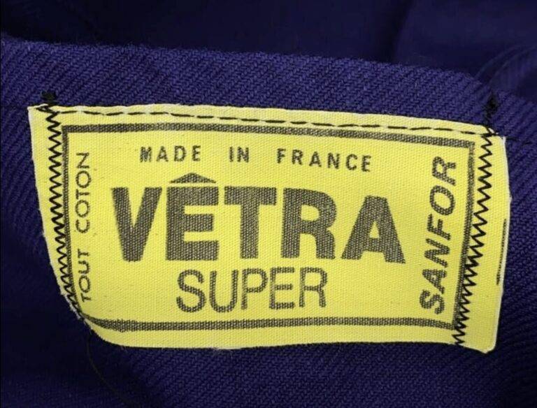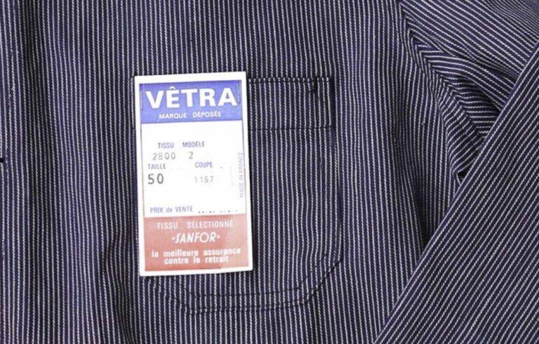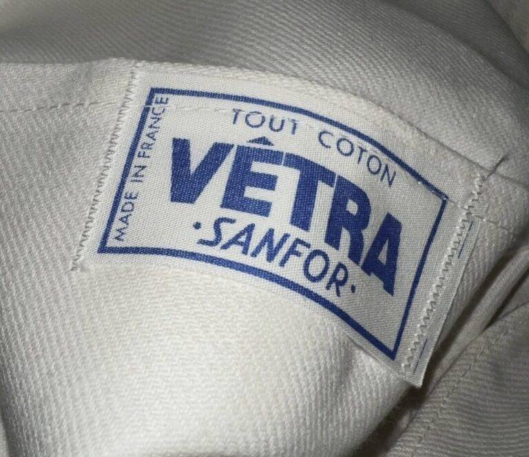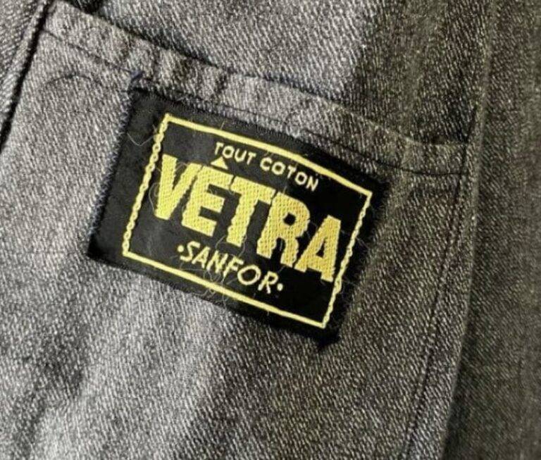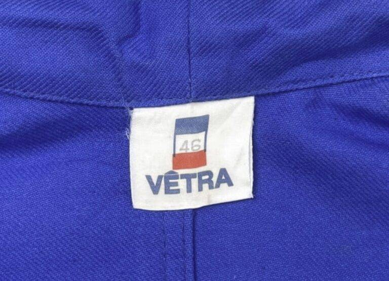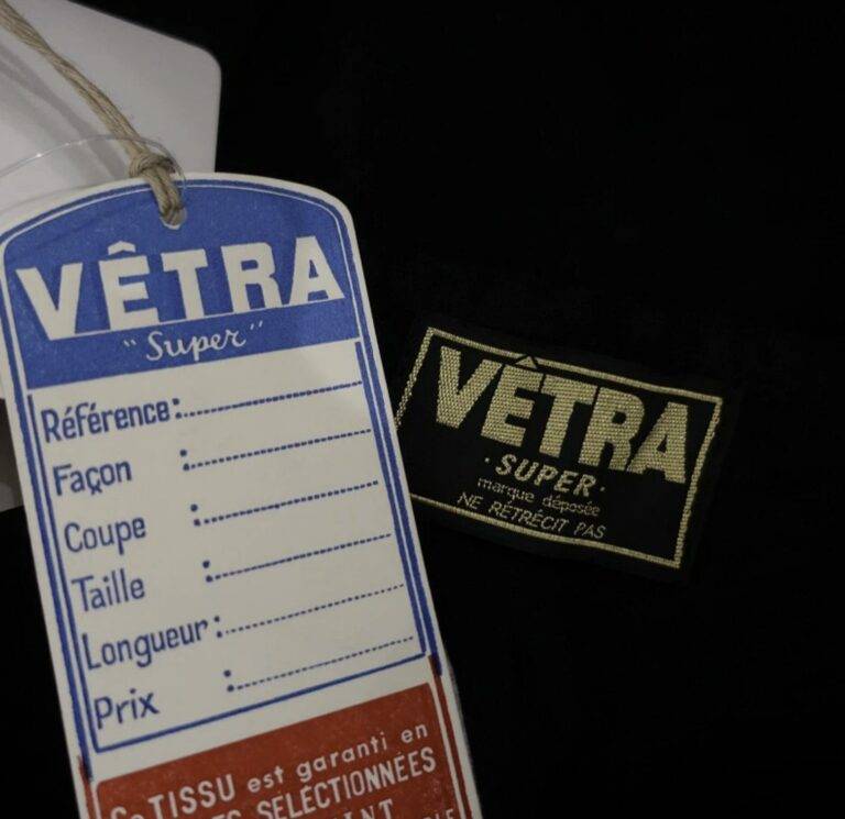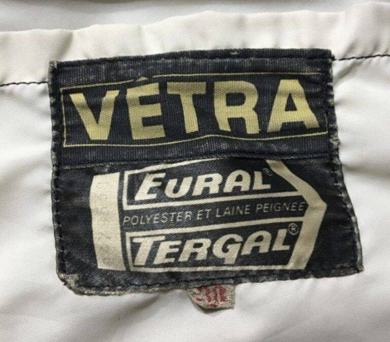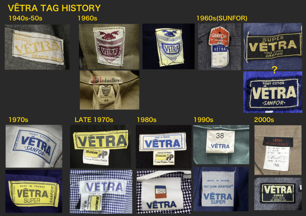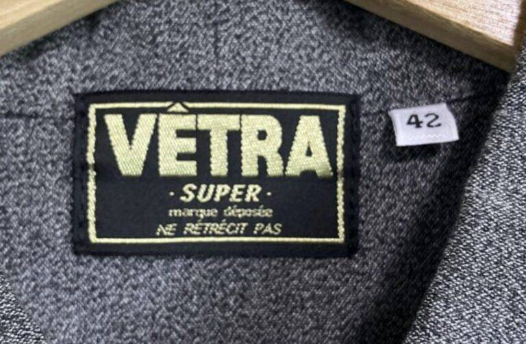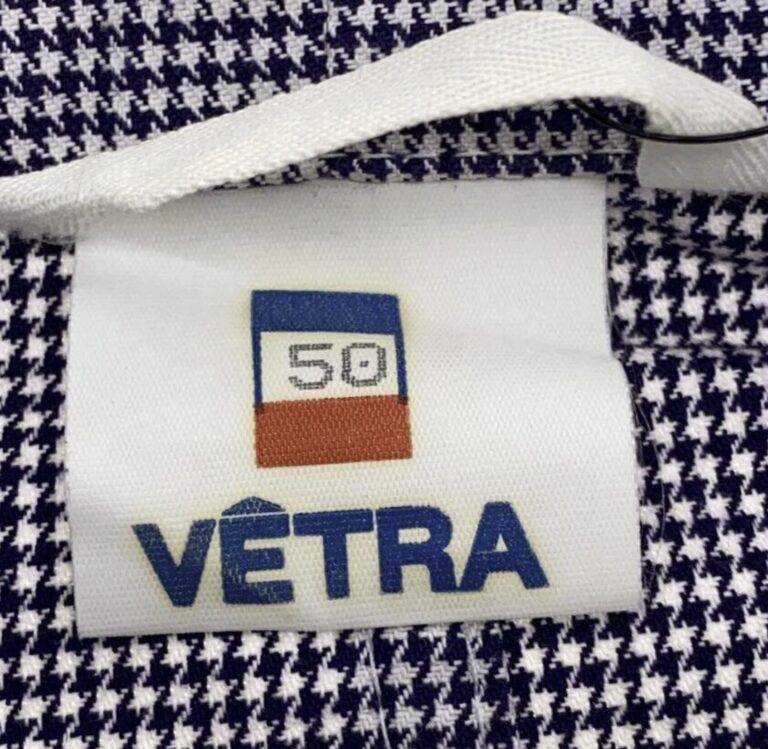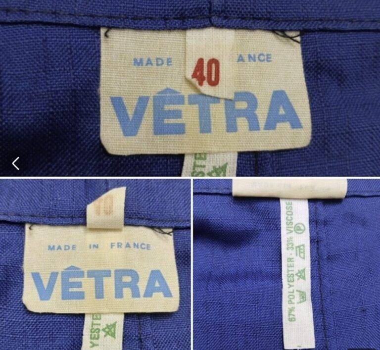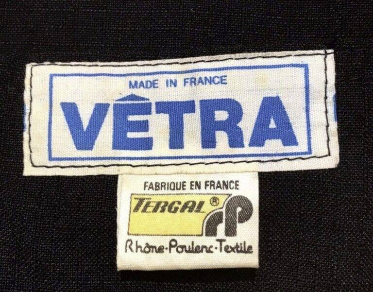 1970年代から80年代にかけて、タグのタイポグラフィは視認性の高い縦長のモダンな書体へと移行しました。この時期、VÉTRAはその堅牢な製造背景を活かし、自社ブランドのみならず、1989年に自社工場を閉鎖したDANTONなどの伝統的なブランドの権利や製造を承継・管理する役割を担うようになります。