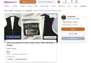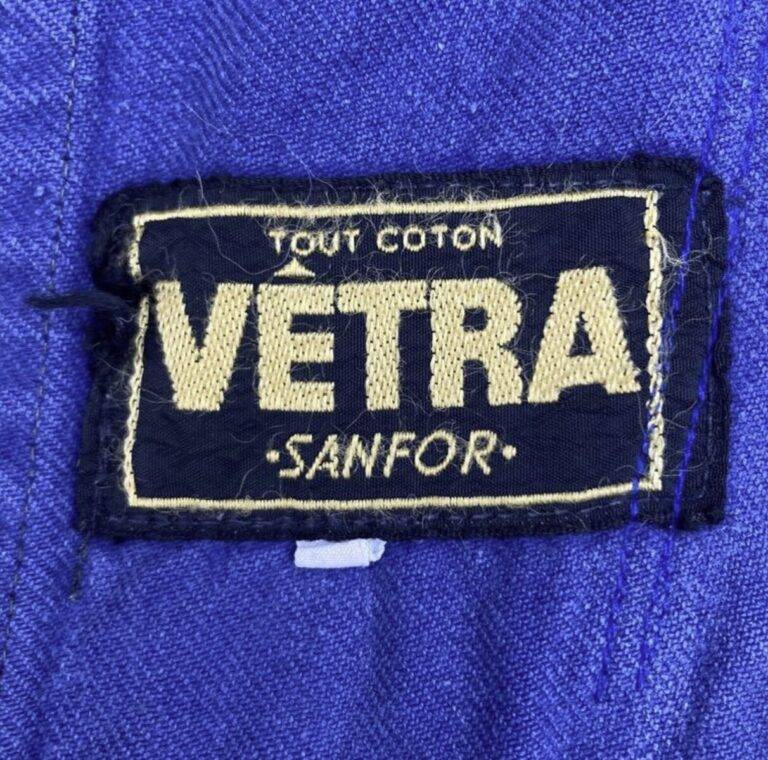 The gold embroidered “VÉTRA” tag, positioned diagonally, features “MARQUE DÉPOSÉE” (Registered Trademark) at the top and “GRAND TEINT” (Colorfast) at the bottom. Given its construction, including the original wood buttons preserved in their initial state, it is inferred that the piece dates to the immediate post-war period. It is finished in a black chambray specification.