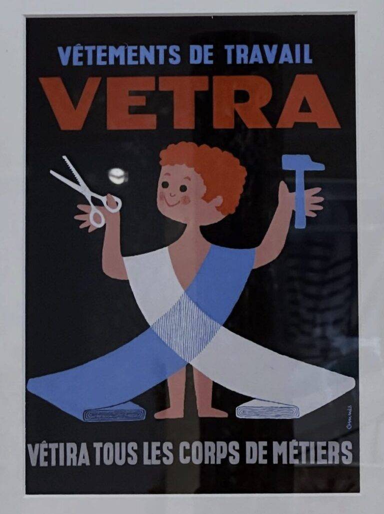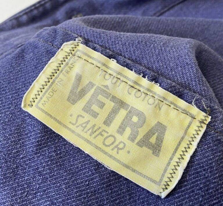 1927年、パリのサン・ルイ島にて産声を上げたVÉTRAは、当初から最高級の資材を用いたワークウェアを製造していました。この時期の製品には、赤色の糸で施された重厚な盾形の刺繍エンブレムが冠され、世界最高峰の堅牢度を誇る建染染料「Indanthren(インダンスレン)」が使用されるなど、仕立て屋としての高い技術と品質を誇示していました。